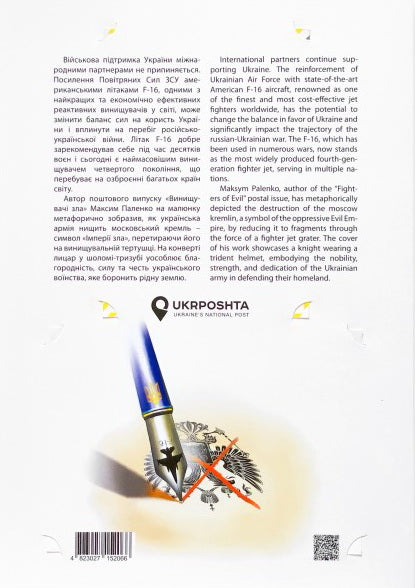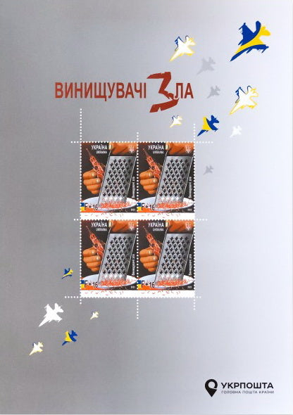 The booklet contains a stamp sheet “Fighters of Evil”, a “First Day” envelope with the cancellation “First Day. Kyiv”, an art envelope and a card. The booklet contains a description of the issue in Ukrainian and English. The issue is charitable. UAH 80 from the sale of each folder will be donated by Ukrposhta to the purchase of drones.
