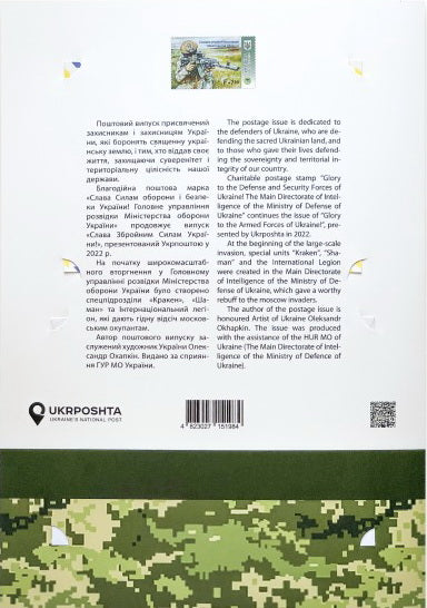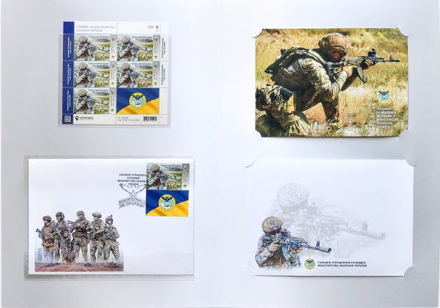 The booklet includes a stamp sheet “Main Intelligence Directorate of the Ministry of Defense of Ukraine,” a “First Day” envelope with the cancellation “First Day. Kyiv,” an art envelope, and a card. The booklet contains a description of the issue in Ukrainian and English.