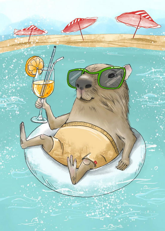 Meet the ultimate relaxation guru — a capybara who’s got the summer vibe down to a science! Cocktail in paw, shades on, and not a single worry in sight. This postcard is perfect for anyone who knows how to chill — or desperately needs to! Send some vacation vibes to a friend, a colleague, or yourself — you’ve earned it!