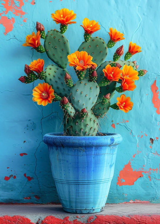 This postcard radiates sunshine and charm! It features a blooming cactus in a vibrant blue pot, set against a weathered turquoise wall with peeling paint. The contrast of the bright orange and yellow flowers with the cool-toned background creates a striking visual harmony.