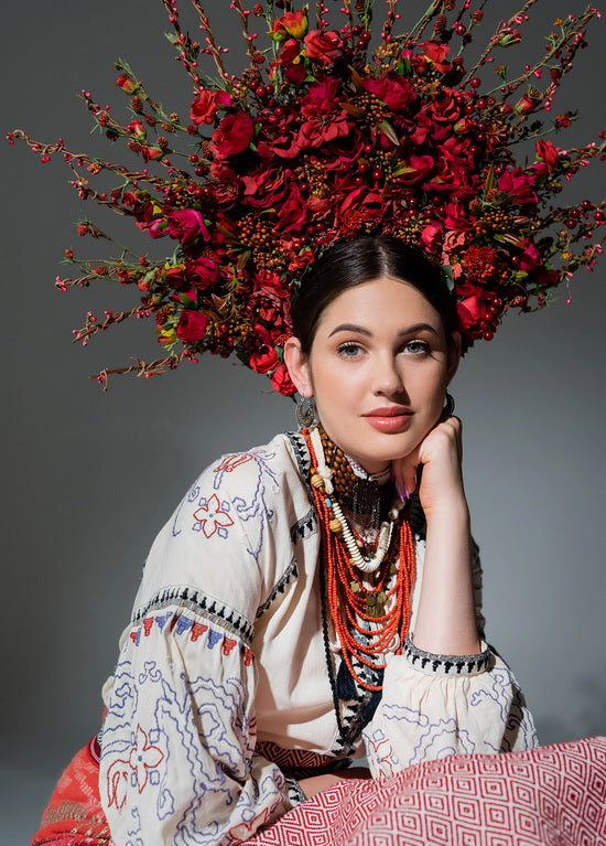 A postcard of a modern Ukrainian girl dressed and decorated like Ukrainian women of the past centuries.