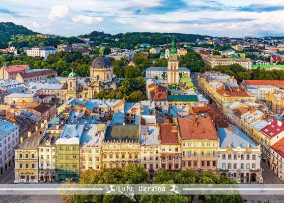 Scenic summer aerial view of the architecture of Rynok Square in the old town of Lviv, Ukraine